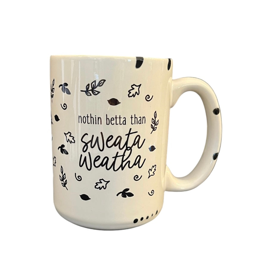 prairie chick prints 15oz ceramic mug. rustic look. white with black lettering. printed on both sides. dishwasher safe on top rack. microwave safe.