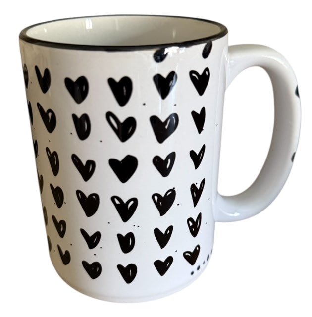 prairie chick prints 15oz ceramic mug. rustic look. white with black hearts. printed on both sides. dishwasher safe on top rack. microwave safe.