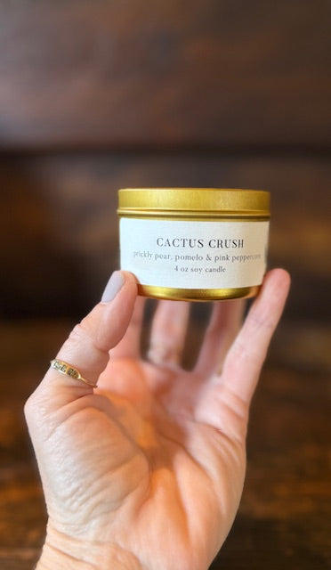 4 oz. desert inspired custom soy candle. prickly pear, pomelo & pink peppercorn scent. gold metal container with lid. created by wtf baskets & gift co.